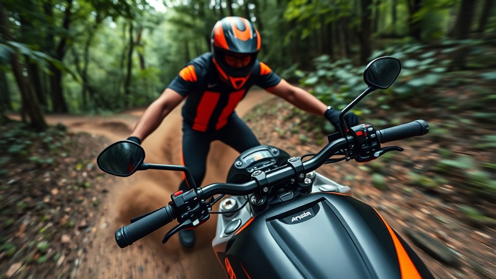Ride-by-wire improves your off-road handling by giving you precise control through an electronic throttle. This system instantly adjusts power delivery, making handling more predictable and responsive on tricky trails. You’ll notice smoother acceleration and better throttle response, especially in challenging conditions. With enhanced handling precision, you can navigate tight turns and uneven terrain confidently, reducing rider fatigue and increasing overall control on your trail adventures.