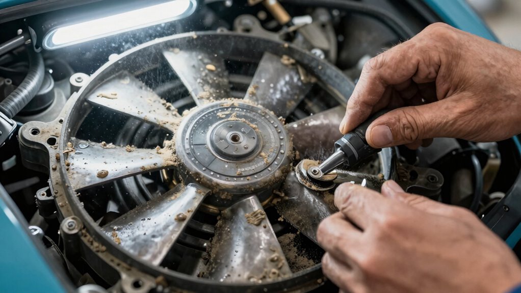 Cleaning your CFMoto’s cooling fans requires careful attention to detail to guarantee ideal airflow and prevent overheating. Begin by disconnecting the battery to eliminate electrical hazards. Remove the fan shroud using appropriate tools, ensuring you note the placement of all fasteners. Use a soft brush or compressed air to dislodge dust, dirt, and debris from the blades and motor housing, avoiding contact with sensitive components. Inspect the blades for damage or corrosion, replacing any compromised parts. Wipe down the shroud with a damp cloth, then reassemble the fan assembly securely. Double-check all connections and fasteners before reconnecting the battery. Properly cleaning the fans enhances airflow efficiency, reduces overheating risk, and extends component lifespan. Follow these steps meticulously for ideal cooling system performance.