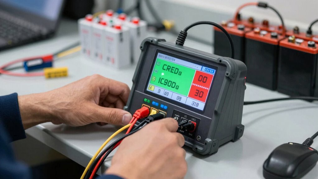 To perform effective battery load testing, you need the right tools. Choosing the correct multimeter, proper test probes, and reliable load testing devices guarantees accurate results. Let’s explore how to select and use these essential tools for your testing needs. Additionally, understanding the proper maintenance of testing equipment ensures longevity and consistent accuracy during your testing procedures. Regular calibration and tool care are crucial practices to maintain the precision of your testing instruments over time. Proper storage practices also help prevent damage and ensure dependable performance.