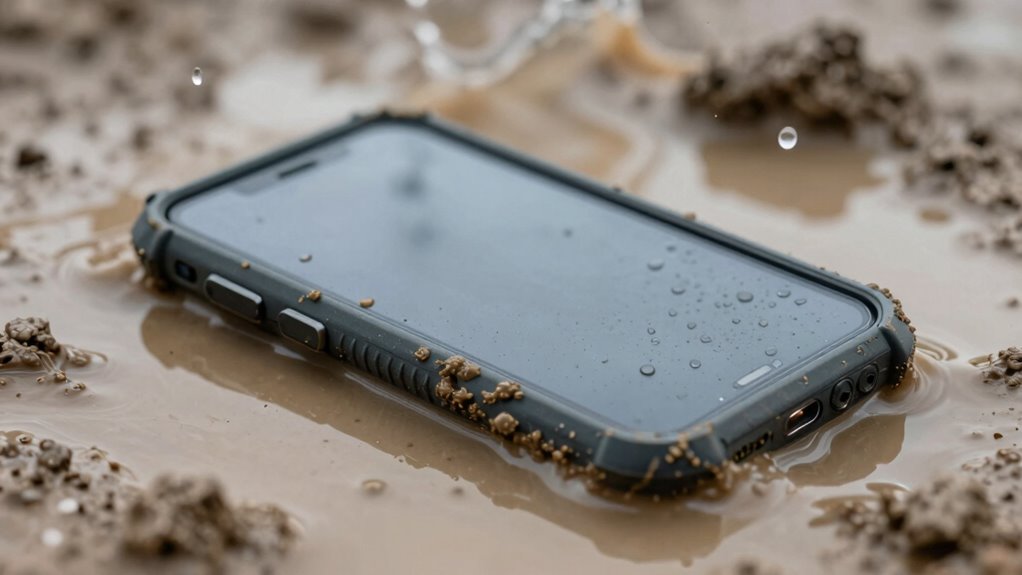 While IP67 and IP68 ratings indicate strong protection against water and dust, handling mud and thick dirt can still pose challenges for these phones. Dust accumulation around ports or seams isn’t the only concern; mud impact can clog vents or create tiny scratches that compromise seals. Although these phones are designed to withstand dust and water, mud’s thicker consistency can sometimes penetrate small gaps, especially if seals are compromised or wear over time. You might think your device is protected, but persistent mud can cause dirt to stick and harden, making cleaning difficult and potentially affecting performance. Overall, while IP67 and IP68 phones offer good defense, they aren’t fully mud-proof, and frequent exposure to thick dirt or mud might reduce their durability over time.