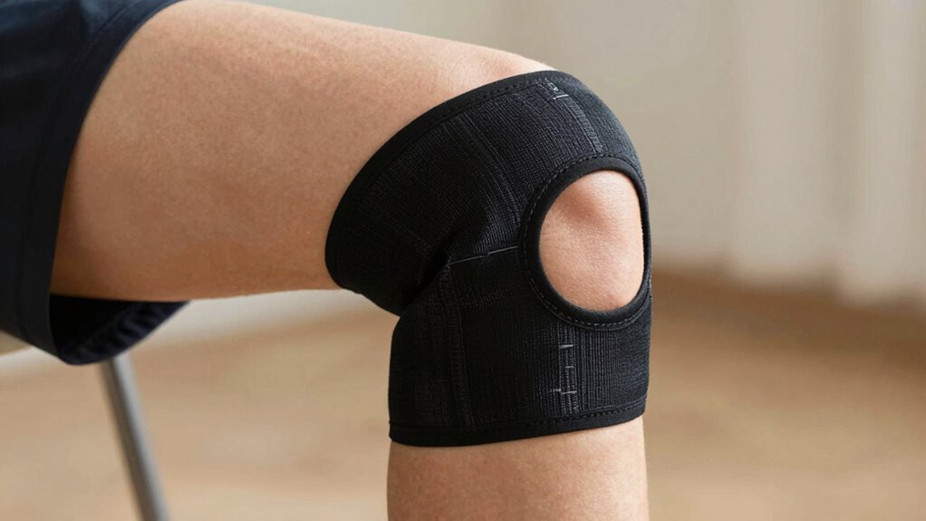 6. Always try the brace on during movement to see if it stays secure without slipping or causing discomfort. A well-fitted knee brace combines material flexibility with durability, guaranteeing it supports your knee effectively while remaining comfortable throughout your activities. This approach aligns with proper sizing techniques to optimize support and comfort.