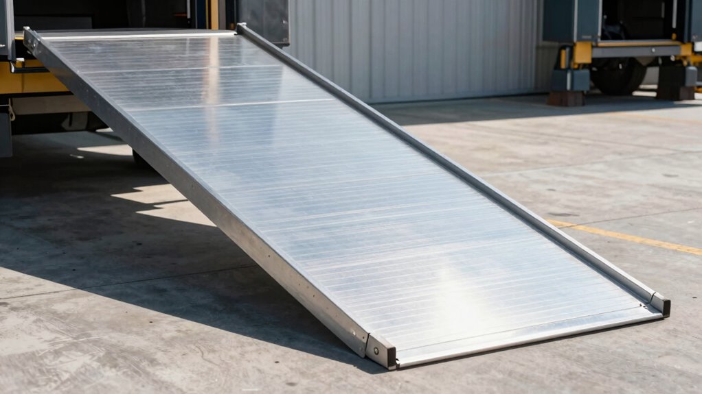 To guarantee your loading ramp is both safe and effective, you need to accurately measure and set the correct angle. Start by selecting appropriate materials that meet regulatory compliance standards and can withstand load stresses. Use a digital inclinometer or a simple carpenter’s level to measure the ramp’s slope precisely. When setting the angle, keep these points in mind: