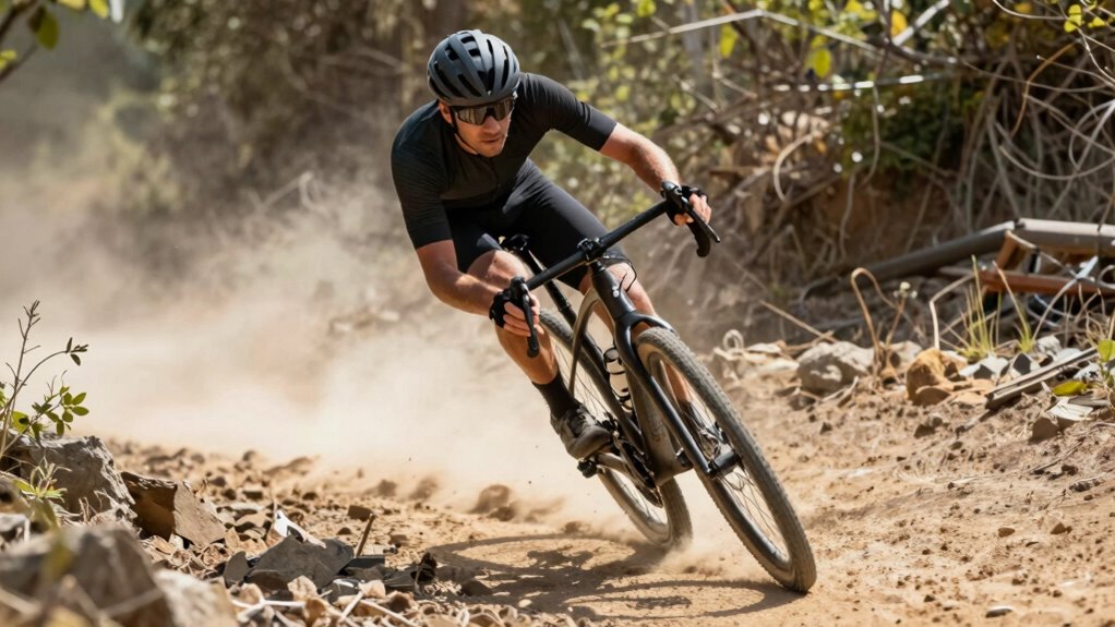 Maintaining proper body position considerably enhances your ride efficiency by optimizing biomechanical leverage and reducing unnecessary energy expenditure. When you adopt an aligned posture, your muscles work more effectively, minimizing fatigue and conserving energy over long distances. Correct positioning ensures better weight distribution, improving traction and stability on uneven terrain. It also facilitates more efficient power transfer from your legs to the pedals, decreasing the effort needed to maintain speed. Evidence from biomechanical studies shows that riders with ideal body alignment experience lower metabolic costs during off-road cycling. Additionally, body alignment plays a crucial role in preventing injuries and ensuring long-term comfort. By focusing on maintaining a centered, balanced posture, you promote smoother pedal strokes and reduce muscle strain. This not only boosts endurance but also enhances control, making your ride more efficient and less tiring. Proper posture encourages the use of core stability, which is vital for maintaining balance and reducing strain during challenging climbs or descents. Developing muscle memory for correct positioning can help you maintain these benefits naturally during your rides.