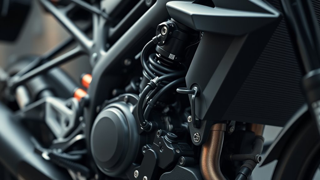 You need to regularly check your Aprilia’s electronic suspension system for proper function. Keep up with brake maintenance to guarantee safety and smooth operation, and regularly check your tire pressure, as it affects suspension performance. Updating the suspension software when prompted by your dealer also helps maintain ideal ride quality. If you notice unusual handling or noises, get it inspected promptly to prevent further issues.