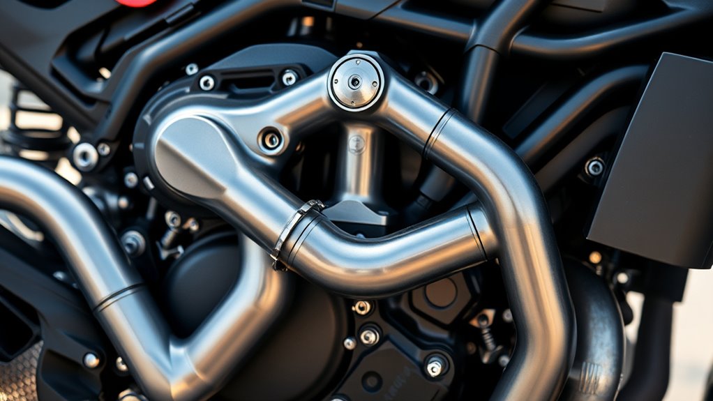 Secondary air injection improves your Ducati engine’s performance by increasing catalytic efficiency, which helps the bike burn emissions more completely. This process reduces harmful emissions and guarantees your engine runs cleaner. When you activate secondary air injection, it boosts combustion in the exhaust system, leading to smoother operation and better fuel efficiency. Ultimately, it helps your Ducati meet emission standards while maintaining ideal performance on the road.