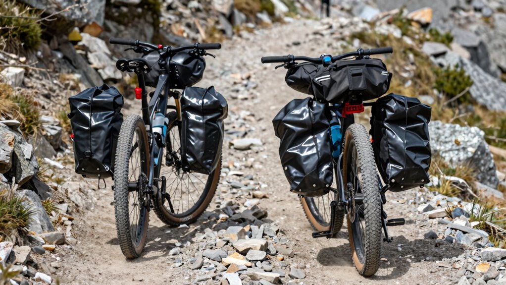 You should choose bike types like touring or adventure bikes for hard panniers, as their sturdy frames typically support higher pannier weight limits and better bike frame compatibility. Soft panniers work well on mountain or commuter bikes, which prioritize maneuverability. Always check the pannier weight limits and guarantee your bike can handle the added load without compromising stability. Proper fit and weight distribution are key to safe, effective pannier use.