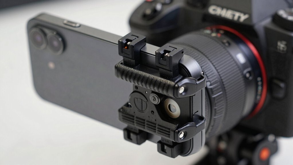 Vibration damping mounts work by absorbing and dissipating the energy generated by mechanical movements. When your device moves or vibrates, the mounts use specialized materials or design features to reduce the transfer of that energy. This process helps protect your camera or phone from shocks and unwanted vibrations, ensuring clearer images and stable footage. To be effective, the mounts must be compatible with your device, so check mount compatibility before installation. Additionally, mounting accessories like adapters or brackets play a crucial role in securing the mount properly and maximizing vibration absorption. Proper mount placement is essential for optimal performance. By effectively managing vibrations, these mounts improve device performance and longevity, making them an essential accessory for anyone serious about protecting their equipment from mechanical shock and instability. Proper understanding of vibration absorption techniques can further enhance the effectiveness of your damping mounts.