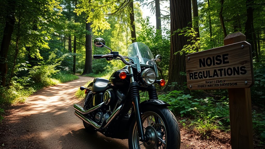 When you’re trail riding your Harley, it’s important to follow local noise regulations to avoid fines and disturbances. Many areas set maximum decibel levels to protect wildlife and quiet trails, so consider installing quieter exhausts and maintaining your bike properly. Be mindful of other riders, hikers, and animals by avoiding unnecessary revving and keeping noise to a minimum. Staying informed about these rules helps you enjoy your ride responsibly—if you keep going, you’ll discover how to stay compliant and respectful.