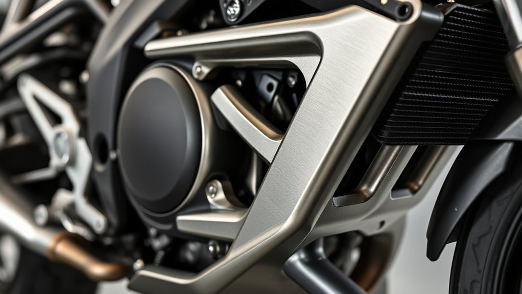 Suzuki pays close attention to installation techniques when fitting these lightweight subframes. Precise installation ensures that the subframes integrate seamlessly with the motorcycle’s chassis, maintaining ideal alignment and structural integrity. During assembly, Suzuki employs specialized techniques such as precision welding and torque-controlled fastening, which guarantee that every connection is secure and capable of withstanding various riding stresses. These installation techniques minimize vibrations and flexing, which can compromise handling and rider confidence. Proper installation also helps in evenly distributing loads across the frame, reducing the risk of premature wear or failure. By meticulously following these techniques, Suzuki maximizes the benefits of their lightweight subframes, ensuring they perform consistently over time. Additionally, material science advancements play a crucial role in developing these innovative subframes, enabling a perfect balance between weight reduction and durability.