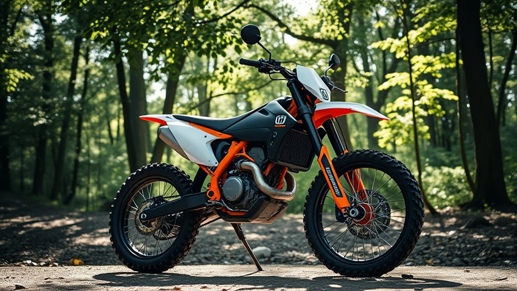 At the core of Husqvarna’s design philosophy is engineering innovation. You’ll notice that each enduro bike features cutting-edge technology, from advanced suspension systems to lightweight chassis design. These innovations aren’t just about performance—they’re about making your ride smoother, more responsive, and more adaptable to challenging terrains. Husqvarna invests heavily in research and development, pushing boundaries to optimize weight distribution, durability, and handling. This means when you’re steering through tricky trails or tackling steep climbs, your bike responds precisely as you intend, thanks to thoughtful engineering that minimizes weight without sacrificing strength. Every part is engineered to enhance your experience, emphasizing efficiency and control.