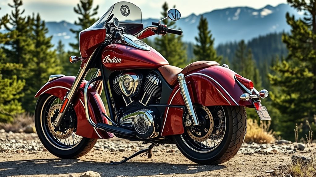 The Indian Chief features a sophisticated Progressive Suspension System that offers you smooth rides, better stability, and adaptability across different loads and terrains. It adjusts dynamically to uneven surfaces, ensuring comfort whether you’re solo or carrying luggage. The front and rear suspensions work together for precise handling and control, making your riding experience secure and enjoyable. If you want to learn more about how this system enhances your ride, keep exploring the details ahead.