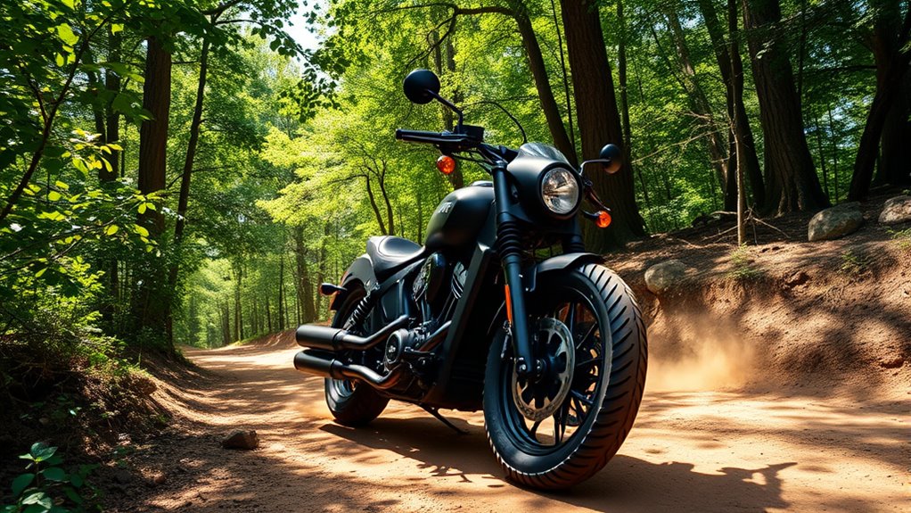 To adapt your Indian Scout for off-road trails, start by upgrading to dual sport or knobby tires for better grip on dirt and gravel. Install a skid plate to protect the engine and frame, and upgrade your suspension for smoother rides over rocky terrain. Adding auxiliary lights improves visibility in low-light conditions, while luggage racks help carry gear for longer trips. Keep in mind, tailored modifications make your bike trail-ready—exploring these options further will help you craft the perfect setup.