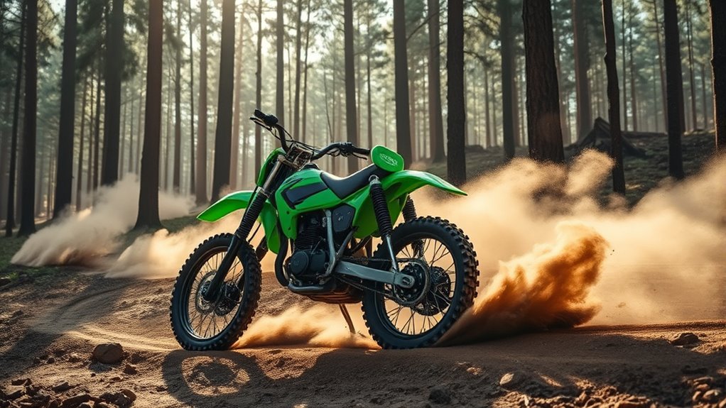Kawasaki’s motocross history isn’t just about racing victories; it’s about a legacy of pushing boundaries and refining performance. The KX models, like the KX250 and KX450, have been fundamental in shaping motocross standards, emphasizing agility, durability, and speed. These bikes have a storied past of helping riders develop skills that translate seamlessly into trail riding, where control and finesse are crucial. When tackling challenging trail conditions, your riding technique must adapt—using body positioning to maintain balance, choosing the right lines to avoid obstacles, and mastering throttle control for ideal traction. Kawasaki’s off-road bikes are designed with these techniques in mind, offering responsive handling and reliable power delivery that boost your confidence on unfamiliar terrain.