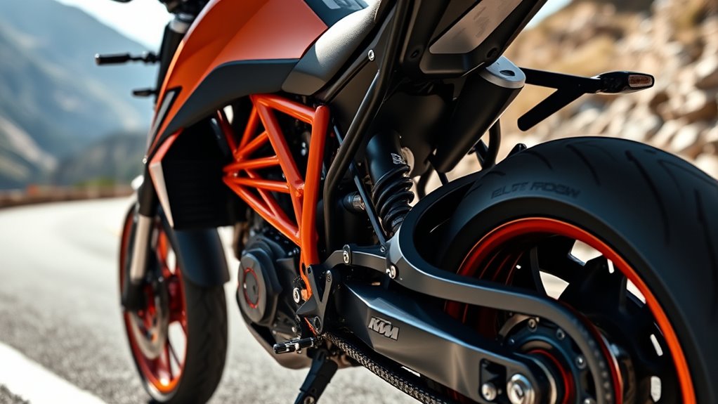 Imagine carving through the wind on a feather-light machine. KTM uses composite materials like carbon fiber and lightweight alloys such as aluminum and titanium to shed unnecessary weight. These materials act like armor for your bike, providing strength without bulk. By carefully selecting and engineering these advanced materials, KTM crafts a ride that’s agile, responsive, and optimized for peak power-to-weight performance, making your riding experience exhilarating and efficient.