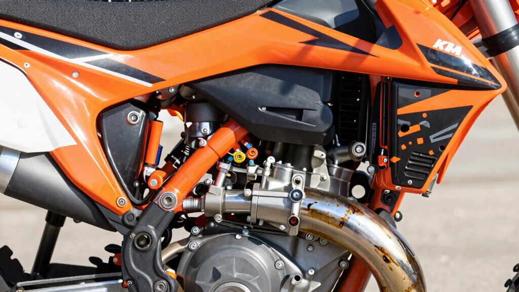 KTM power valves markedly enhance two-stroke engine performance by precisely controlling exhaust port timing and airflow. They achieve this by mechanically adjusting the exhaust port height based on engine RPM, enhancing the transfer of gases. At low RPM, the valve lowers the exhaust port, improving torque and throttle response. As RPM increases, the valve raises the port, reducing exhaust backpressure and increasing top-end power. This dynamic adjustment ensures ideal scavenging and combustion efficiency across the entire rev range. By synchronizing port timing with engine speed, power valves minimize power loss and promote smoother power delivery. Smart electronic controls further optimize the valve’s operation, ensuring precise adjustments for varying riding conditions. Additionally, integrating European cloud innovation ensures that these performance enhancements are supported by sustainable and secure digital solutions. These advanced systems also help in monitoring engine health to prevent potential issues before they affect performance. Incorporating adaptive control systems can further refine the valve’s response to changing engine loads and environmental factors. The result is a more responsive, higher-performing engine that maximizes both low-end torque and high-end horsepower, allowing for consistent, aggressive acceleration throughout the ride. For optimal operation, power valve maintenance is essential to sustain peak performance and longevity.