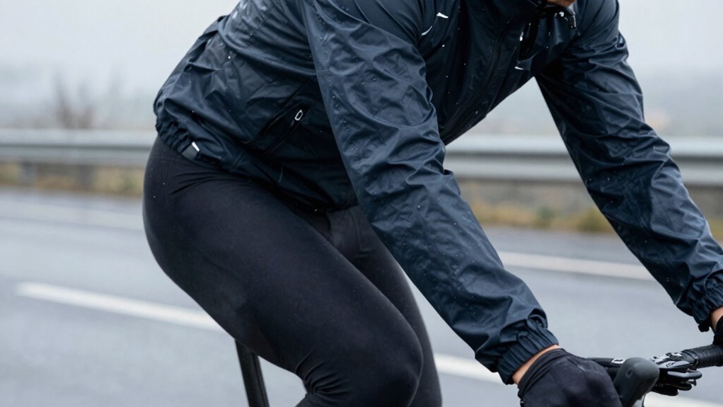 When your rain gear fits properly, it’s less likely to flap in the wind. Adjust the straps to guarantee a snug, secure fit that stays in place. This not only keeps your gear quiet but also provides better protection from the elements. Proper fit can also prevent unnecessary wear and tear, extending the lifespan of your rain gear through effective management. Ensuring a good fit is especially important for safety considerations when driving on windy highways.