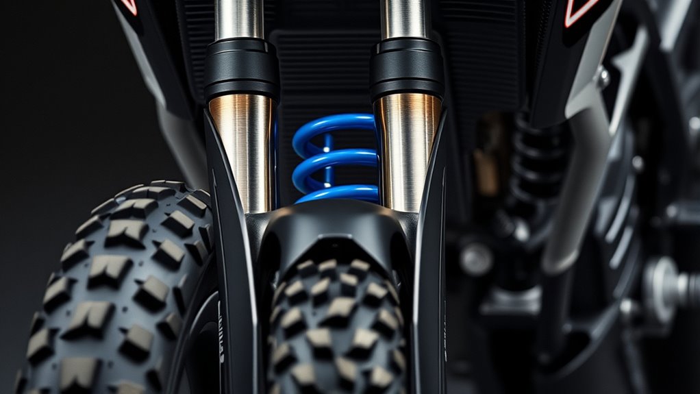 Suspension plays a vital role in your bike handling off-road. Proper suspension tuning guarantees you maintain control over rough terrain, absorbing shocks and preventing you from losing balance. It also enhances rider comfort, reducing fatigue during long rides. When your suspension is well-adjusted, you can navigate obstacles smoothly, stay confident, and respond quickly to changing conditions, making your off-road experience safer and more enjoyable.