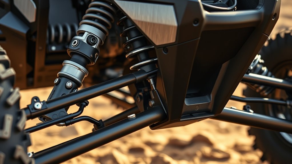 Furthermore, the integration of smart suspension technology enhances your control and handling. When the suspension responds instantly to terrain changes, your vehicle remains more predictable and easier to maneuver. You’ll experience better traction and reduced body roll, making challenging sections of trail feel more manageable. This level of responsiveness allows you to push further into off-road adventures with greater confidence, knowing your suspension system is actively working to optimize your comfort and control. Overall, Polaris’ smart suspension innovations are transforming how you experience off-road riding, making every trip smoother, safer, and more enjoyable.