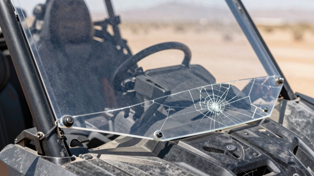 Regular maintenance is essential to keep your UTV windshield in top condition and prevent cracks from forming. Start by regularly cleaning it with a soft cloth and mild soap to avoid scratches. Avoid using abrasive cleaners or tools that could damage the surface. Consider windshield tinting to reduce sun glare, which minimizes stress on the material. When adding aftermarket accessories, ensure they are properly installed to prevent undue pressure or cracks. Check for chips or minor cracks and repair them promptly to prevent further damage. Protect your windshield from debris and harsh weather conditions by covering your UTV when not in use. Proper upkeep and mindful installation of accessories help extend your windshield’s lifespan and maintain its integrity. Additionally, understanding the materials used in your windshield can help you choose the best options for durability and longevity. Recognizing the impact resistance of different materials can also guide you in selecting the most impact-resistant option for your needs. Furthermore, selecting impact-resistant materials can significantly reduce the likelihood of cracks caused by debris or accidents.