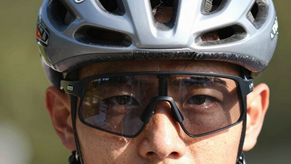 When your helmet presses against your glasses, pressure points often develop, leading to discomfort and pain. This usually happens when helmet padding isn’t properly positioned or if strap tension is too tight, pushing your glasses into your face. Over-tightening the strap can increase pressure on specific spots, causing soreness and even headaches after long rides. Properly adjusting helmet padding ensures even contact, reducing localized pressure. Looser strap tension can also help, allowing your glasses to sit more comfortably without being squeezed. Keep in mind that the shape of your helmet and glasses also influence pressure points. If your glasses press into your temples or nose, it’s a sign you need to fine-tune the fit to prevent ongoing discomfort on your rides.