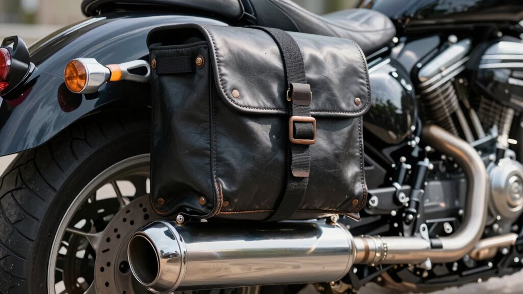 Mounting your tool bag away from the exhaust is essential to prevent it from melting or becoming damaged. The materials of your tool bag, whether leather, nylon, or canvas, each have different heat tolerances, but all are vulnerable to prolonged exposure to exhaust heat. Exhaust heat can reach temperatures high enough to weaken or warp materials, especially if your bag is made from synthetic fabrics or thin leather. If placed too close, the heat can cause melting, discoloration, or even structural failure of your tool bag. By mounting it farther away, you protect your tools and extend the lifespan of your bag. Proper heat shielding can also help reduce the risk of heat damage when positioning your tool bag near the exhaust system. Additionally, understanding heat output and how it varies with engine operation can help you choose a safer mounting location. Being aware of heat dissipation characteristics can further aid in selecting an optimal mounting position to minimize risk. Furthermore, considering thermal insulation options can provide extra protection against heat transfer, ensuring your tool bag remains safe even if mounted closer to the exhaust.