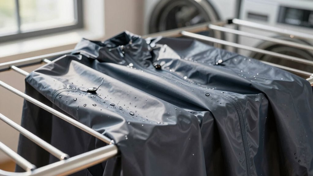 In a heartbeat, different laminate materials dry at varying rates. You’ll notice that fabrics with more breathable waterproof layers tend to dry faster because they allow moisture escape, preventing water from lingering. Some laminates, like those with thinner or more advanced membranes, wick moisture away quicker, while thicker layers trap more water. So, your jacket’s material considerably impacts how fast it dries, especially in wet conditions.