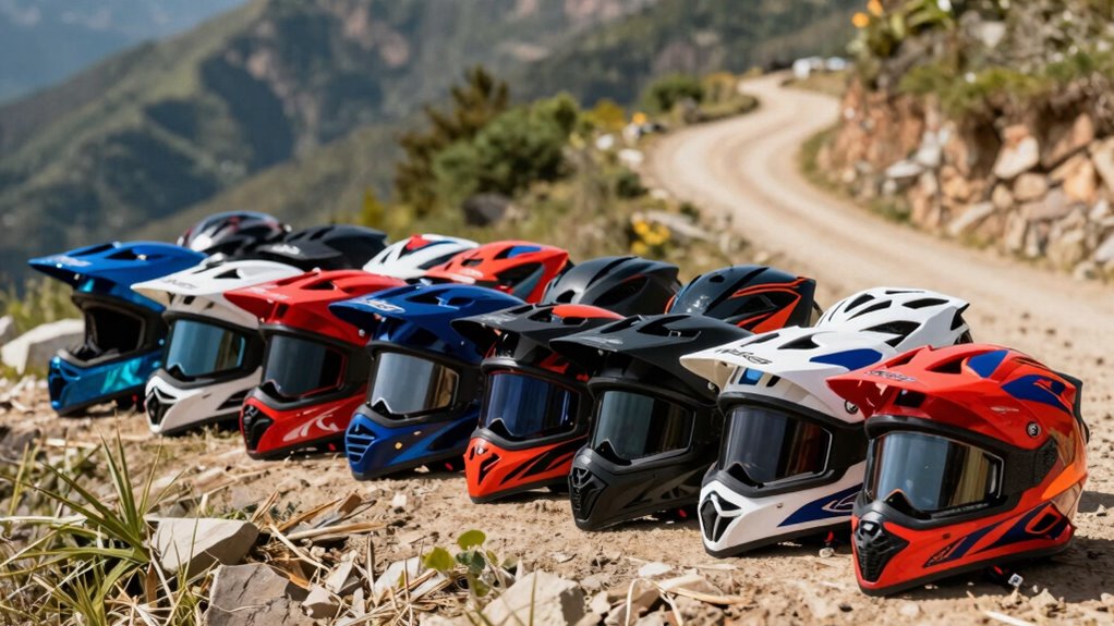 Clear and wide eye ports are vital for maintaining good peripheral vision, which is essential for staying aware of your surroundings on challenging off-road trails. A helmet with a large, optically correct shield reduces distortion and provides sharp, unobstructed views, decreasing fatigue and distraction. Dual visor systems, including internal sun shields, let you adapt quickly to changing light conditions without removing the helmet, keeping you focused on the ride. Anti-fog and anti-scratch coatings maintain clear visibility in diverse weather and riding environments. Removable and adjustable face shields or visors offer customization for different scenarios and personal preferences. Overall, these visibility features ensure you stay alert, safe, and confident, whether steering through rocky trails or bright, open landscapes.