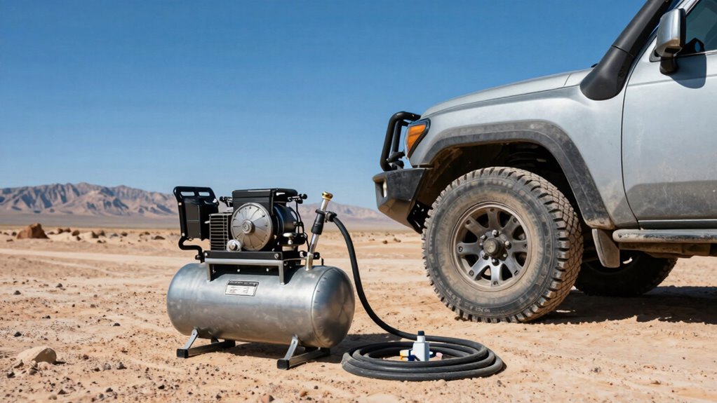 Maintaining my overlanding air compressor tank is like tending a garden — it keeps everything running smoothly. I check for leaks and listen for unusual sounds regularly, and I guarantee the tank is drained of moisture after each trip to prevent rust. I also inspect the hoses and fittings for wear and replace them if needed. Regular maintenance keeps my compressor reliable, just like a well-loved vehicle.