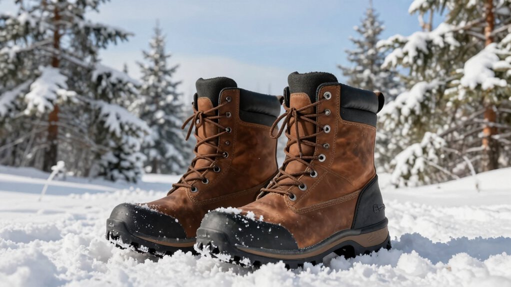 Choosing the right off-road boots for cold weather hinges greatly on their insulation and warmth features. Effective insulation materials like Thinsulate, fleece lining, and neoprene are essential for keeping feet warm in extreme cold conditions. The insulation level, measured in grams, indicates how much warmth the boots provide; higher grams mean better heat retention—think 200g versus 1200g. Multi-layer insulation systems, such as neoprene paired with fleece or thermal linings, boost overall warmth and comfort during extended outdoor activities. Proper insulation prevents heat loss through conduction and convection, helping maintain internal foot temperature even in sub-zero environments. Many insulated boots also feature temperature ratings, like -25°F, giving you a clear idea of their thermal performance and ensuring you stay warm no matter how harsh the conditions.