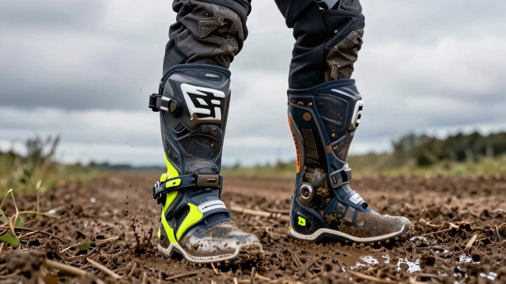 Durability is a critical factor when selecting boots for mud riding because tough terrains demand gear that can handle constant wear and tear. I look for boots with reinforced toes, heels, and sides to resist abrasive impacts. High-quality rubber and neoprene materials are essential because they prevent tearing, cracking, and deformation over time. Heavy-duty outsoles with deep, aggressive treads boost longevity by offering better traction and resisting wear from mud and debris. Sealed construction and waterproof membranes help keep water out, reducing material deterioration caused by moisture. Reinforced stitching and impact-resistant plates add extra strength, ensuring the boots maintain their structure during demanding rides. These durability features collectively ensure my boots can withstand the harsh conditions of mud riding and last season after season.
