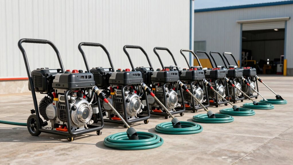 Choosing the right gas-powered commercial pressure washer hinges on understanding its power and pressure levels. These units typically deliver between 3,400 and 4,200 PSI, making them suitable for heavy-duty tasks. The flow rate, measured in GPM, usually ranges from 2.5 to 4.0, which impacts cleaning speed and efficiency. Higher PSI and GPM values mean more cleaning power, ideal for stubborn grime, mold, or surface prep. Engine power, often between 6.5 and 7.0 HP, directly influences maximum pressure and flow rate. It’s essential to maintain appropriate pressure settings to clean effectively without damaging surfaces, especially when switching nozzle types. Matching power and pressure levels to your specific cleaning needs ensures maximum performance and longevity of the pressure washer.
