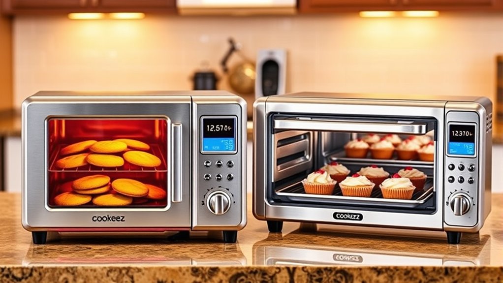 Think of a Cookeez Makery oven as a trusty guard dog in your kitchen. It comes with safety features like a cool-touch exterior, automatic shut-off, and child lock to keep little hands safe. I feel confident letting kids use it because these features act like a protective shield. Plus, clear instructions guarantee everyone can enjoy baking safely, making the process fun without worry.
