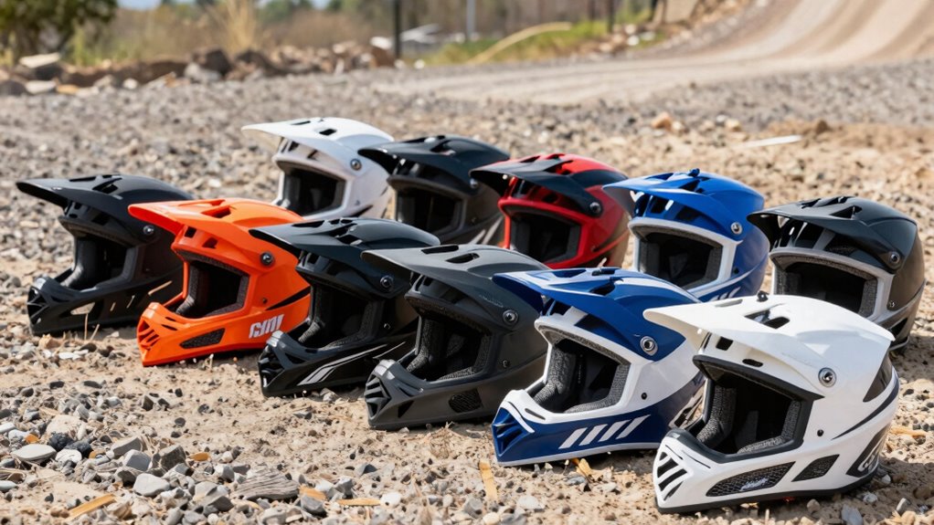 When choosing a dirt bike helmet that works well with a neck brace, the materials used in its construction are critical for durability and safety. Helmets made from high-strength thermoplastic resin or impact-resistant ABS are essential for withstanding impacts and protecting both your head and neck. The outer shell should be reinforced to prevent cracking or deforming during crashes, ensuring long-term reliability. Inner linings crafted from removable, washable, and moisture-wicking materials help maintain durability and comfort over time. Reinforced seams and quality adhesives keep the helmet structurally sound under demanding riding conditions. Additionally, choosing helmets with safety certifications like DOT or FMVSS 218 guarantees the materials meet strict safety standards, giving you confidence in their durability.