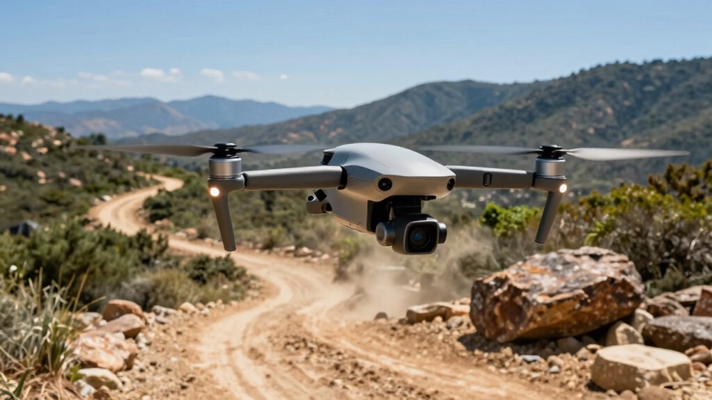 Did you know that some drones can operate at altitudes over 16,000 feet? I’ve found that many high-end models handle high-altitude off-road adventures pretty well, thanks to advanced sensors and powerful motors. I always recommend checking a drone’s max altitude before heading out, as it guarantees you capture those breathtaking views without losing connection or performance. With the right drone, high-altitude filming becomes not just possible, but also smooth and reliable.