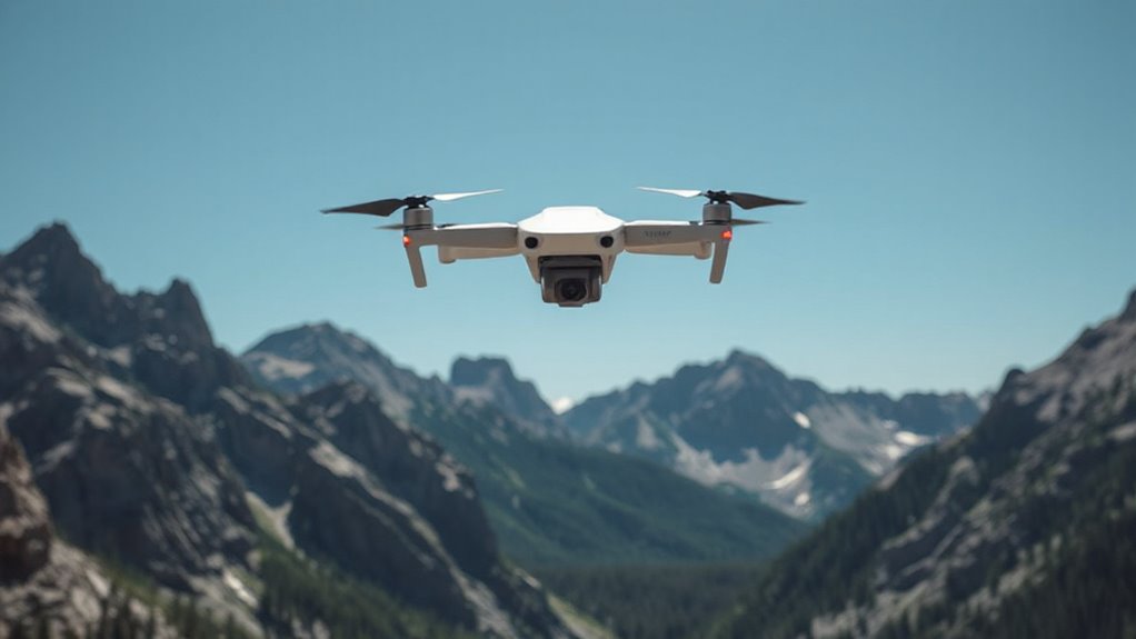 Choosing a drone with effective flight safety features is essential for adventure filming, especially in unpredictable environments. Drones equipped with obstacle avoidance sensors can detect and navigate around obstacles in real-time, greatly reducing crash risks. Multiple directional sensors, like four-way infrared or laser radar, provide thorough obstacle detection in complex terrains. Features such as auto-return and low-battery alarms work together with obstacle sensors to prevent loss or collisions caused by navigational errors. Optical flow positioning and GPS stabilization help maintain a steady hover and accurate flight path, even with unpredictable terrain. However, proper calibration and understanding of these safety features are vital for safe operation, especially in environments with moving obstacles or dense clutter. These features give me confidence to focus on capturing epic footage without constant worry.