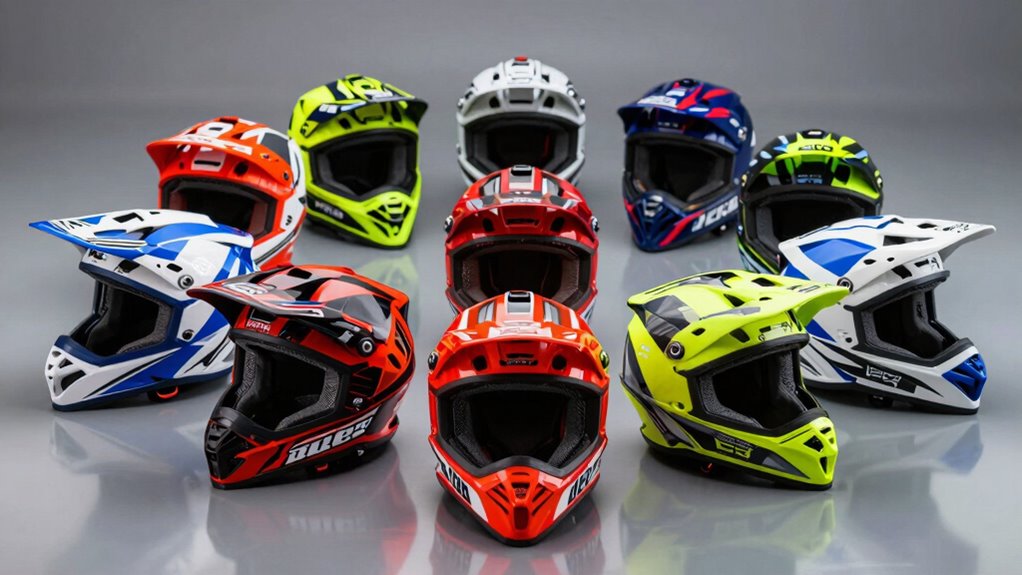 Clear visibility is vital for safety and performance during motocross rides, especially in challenging weather conditions. Many ECE 22.06 helmets come with Pinlock-ready visors and fog-resistant inserts to keep your view clear. Dual visors or anti-fog coatings on the primary visor also help prevent fog buildup during intense rides. Effective ventilation, including multiple intake and exhaust vents, reduces internal humidity, minimizing visor fogging. Some helmets feature advanced anti-fog technologies, like special coatings or integrated systems, actively preventing fog formation without impairing visibility. Proper fit and well-sealed visors are essential, as they limit airflow gaps that cause fogging. Overall, these features guarantee consistent clarity, so you can stay focused and safe regardless of weather or riding conditions.
