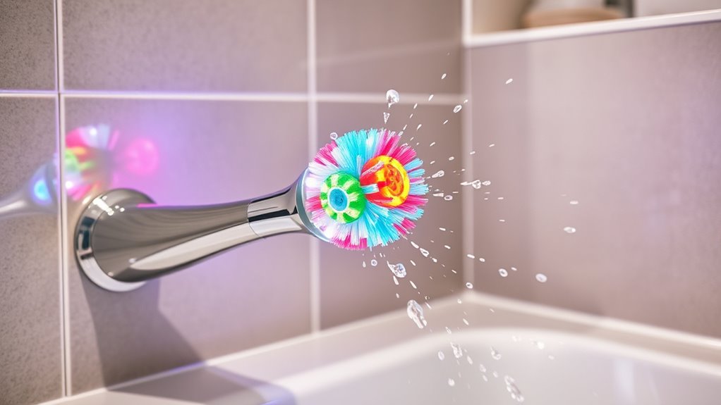 An adjustable handle length is a game-changer when it comes to cleaning efficiency and comfort. It lets me customize the scrubber’s reach from about 12 inches up to over 50 inches, making it perfect for different tasks. The telescopic or extendable handle means I don’t have to bend or kneel, which is especially helpful when reaching high ceilings or behind appliances. Handles that lock securely or twist easily give me stability and convenience during use. Longer handle ranges are great for elderly users or anyone with limited mobility, reducing strain. Plus, the ability to quickly change handle length makes the scrubber versatile, so I can clean floors, ceilings, and hard-to-reach corners with ease. It’s a simple feature that considerably improves the cleaning experience.