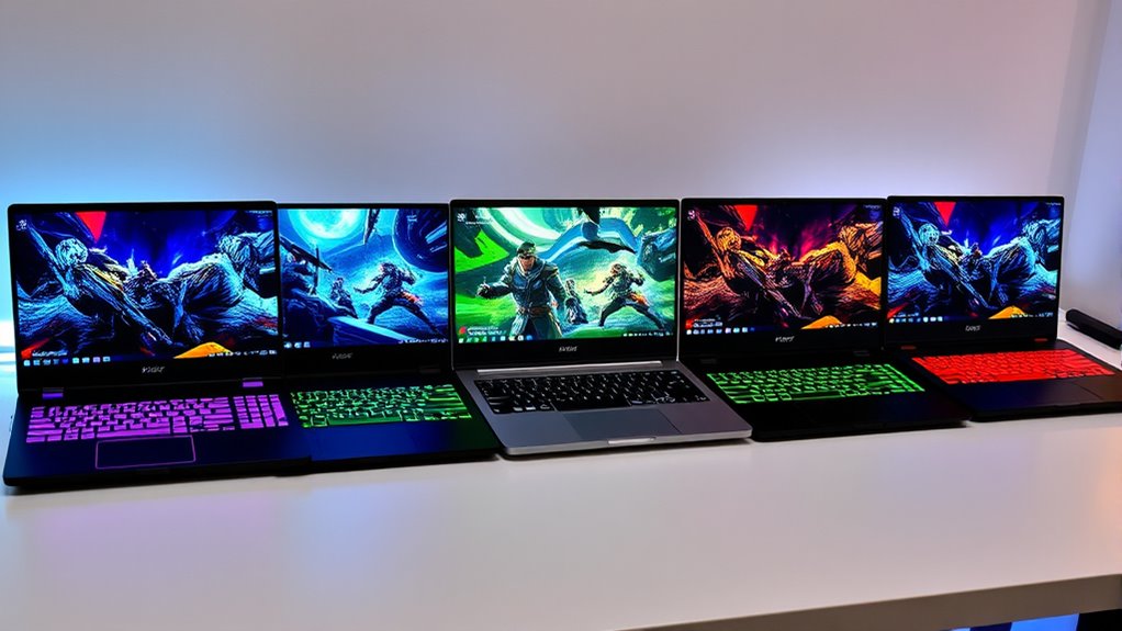 If you’re hunting for the best gaming laptops under $1000 in 2025 that deliver high performance, I’ve got you covered. I recommend models with powerful AMD Ryzen or Intel Core i5/i7 processors, high-refresh-rate screens, and dedicated GPUs like RTX 4050 or Radeon RX series. These machines also offer solid storage, good build quality, and cooling systems for extended gaming sessions. Stick with me, and you’ll find out more about each top pick and what makes them great.