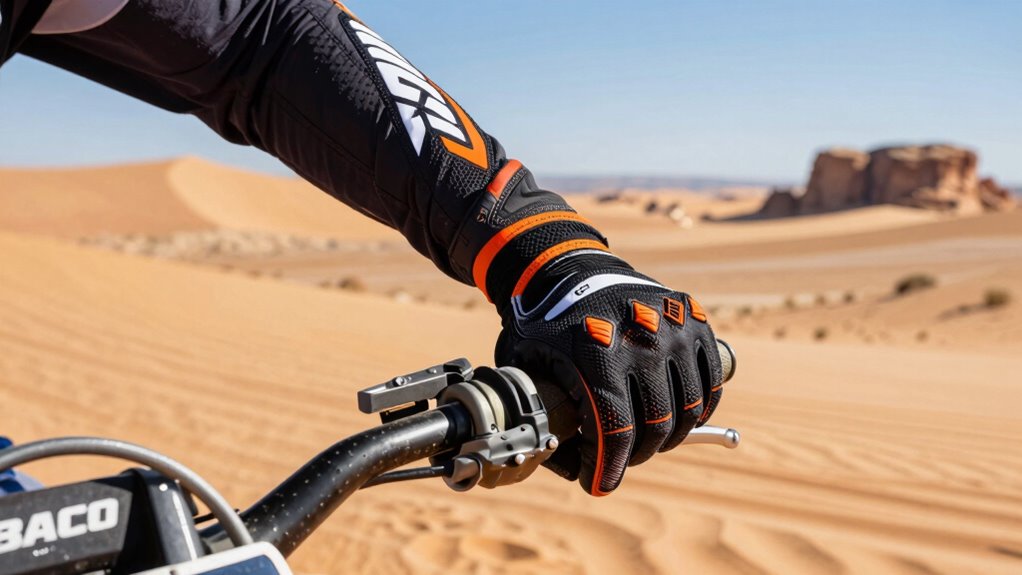 Glove designs prevent sand ingress through tight cuffs and specialized materials. I look for gloves with adjustable closures that seal around my wrists, keeping out dust and sand. Some gloves feature extended cuffs or flaps that cover the wrist area completely. Additionally, seamless or reinforced knuckles help reduce gaps where sand could enter. These features guarantee my hands stay clean and comfortable during long desert rides.