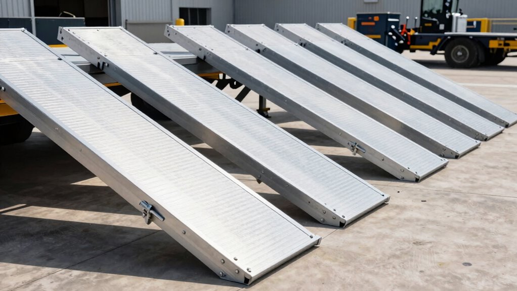 Selecting trailer ramps that can handle heavy equipment starts with understanding the materials they’re made from. High-strength aluminum alloys and steel are common choices because they can support substantial loads without bending or breaking. The thickness of the material, often measured in inches or millimeters, directly affects its strength and durability. Well-designed ramps feature expert welding, corrosion-resistant coatings, and reinforced support structures, all of which extend their lifespan. Material selection also impacts weight; lightweight aluminum ramps are easier to handle while still providing the necessary strength. Proper engineering and robust materials ensure that your ramps can support load capacities ranging from 3,000 to over 23,000 pounds, making them reliable for various heavy-duty applications.