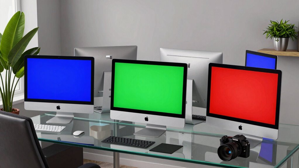 Imagine your workspace wrapped in a digital fortress—that’s what the latest iMacs deliver with their advanced security features. I appreciate the built-in Secure Enclave, which guards my sensitive data, and the improved Touch ID that guarantees only I access my files. Plus, Apple’s robust software updates keep vulnerabilities at bay, giving me peace of mind while I work. It’s a seamless blend of elegance and security I can rely on daily.