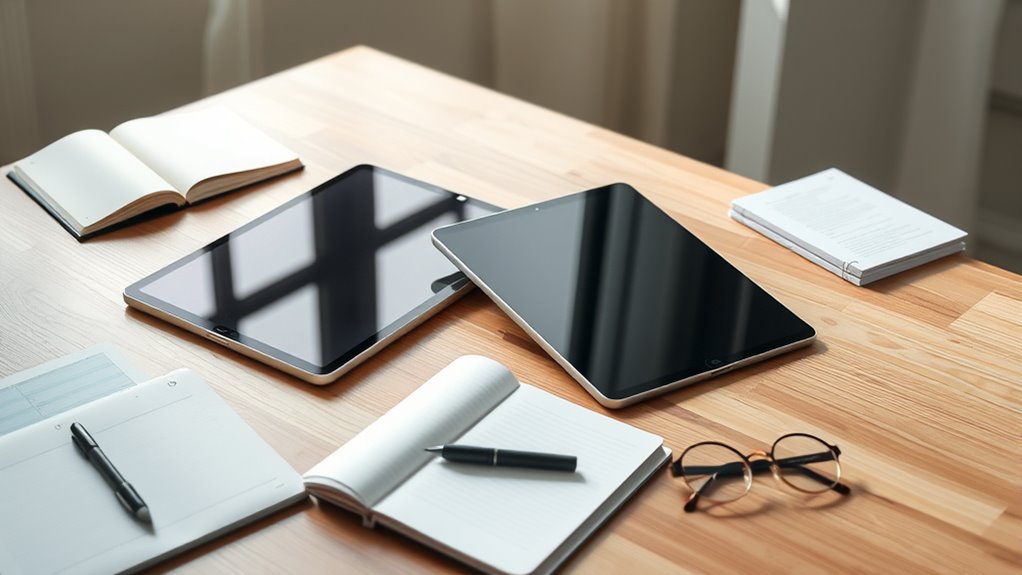 If you’re choosing between the iPad Pro 2025 and the iPad Air as your study partner, consider your needs for power and portability. The Pro offers a bigger, vibrant display and faster performance, perfect for creative projects or multitasking. The Air is lighter, more budget-friendly, and great for note-taking and daily tasks. Want to find out which suits your study style best? Keep exploring to discover all the key differences.