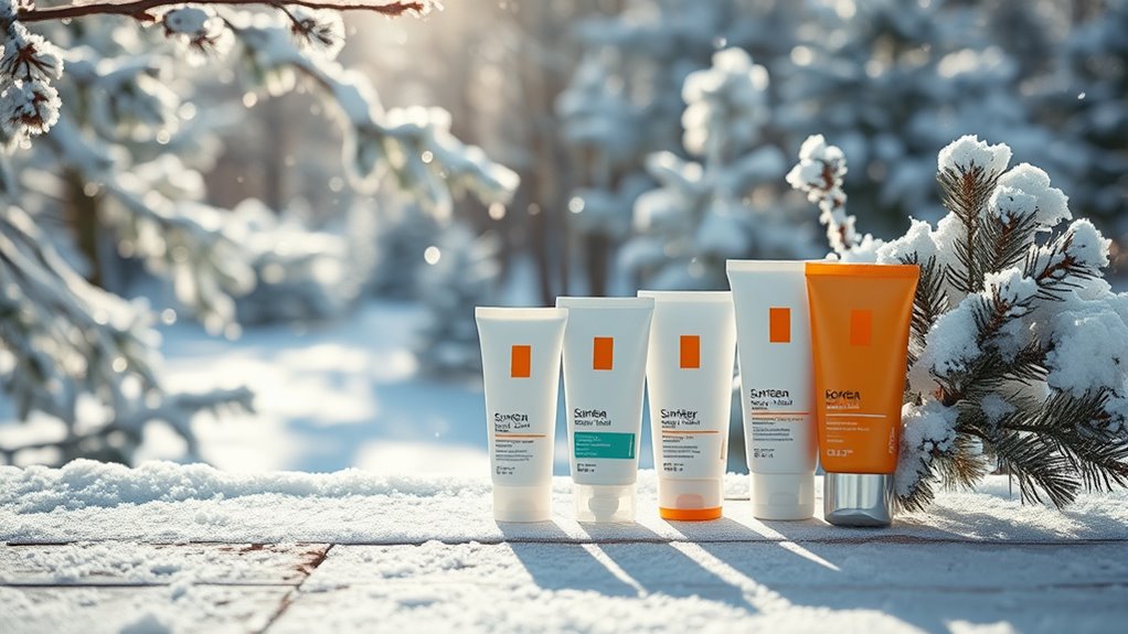 When winter’s cold temperatures hit, my skin often feels drier and more delicate, which makes the right sunscreen more important than ever. Cold weather reduces my skin’s natural oil production, so I look for sunscreens with hydrating ingredients like hyaluronic acid or niacinamide to lock in moisture. The thicker skin barrier in winter also means choosing formulations that help maintain hydration while protecting against environmental stressors. Since snow reflects UV rays, I opt for sunscreens with SPF 30 or higher that offer broad-spectrum protection against UVA and UVB rays. Wind and cold can cause irritation, so I prefer products with calming ingredients like green tea extract or panthenol to soothe my skin. These factors guarantee my skin stays protected and comfortable during winter’s harsh conditions.