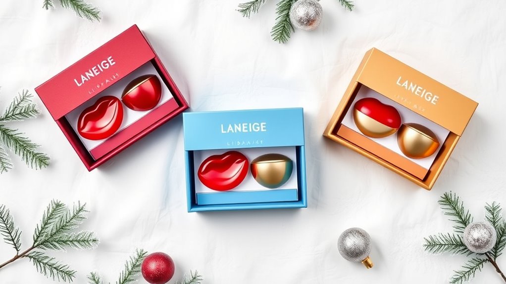 When evaluating a Laneige Lip Mask holiday set, it’s important to contemplate its versatility and overall value. I look for sets that include multiple lip care products or variations, like overnight masks, glosses, or balms, to guarantee comprehensive protection. Comparing the total price to buying items separately helps determine if the set offers good value. Travel-sized options are a bonus, making it easy to maintain lip hydration on the go. I also consider if the set features seasonal or limited-edition items, which can enhance its appeal and perceived worth. Ultimately, a versatile set should cater to different routines and preferences, providing a range of products that maximize benefits without breaking the bank. This way, I get the most out of my holiday purchase.