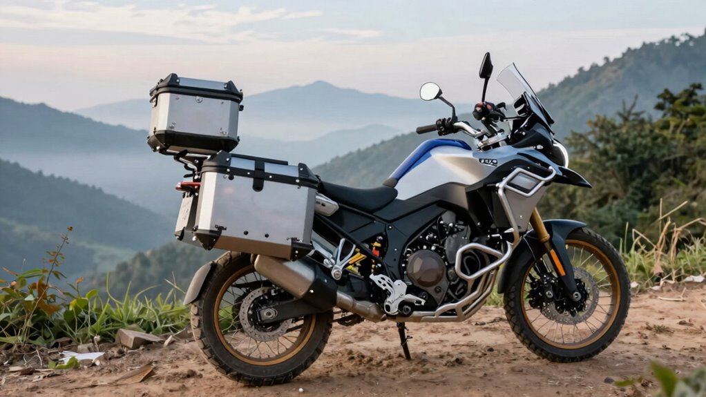 Ever wondered what makes a luggage rack secure and easy to install on your adventure motorcycle? The key lies in design and hardware. A reliable rack should have multiple mounting points and strap slots, ensuring gear stays stable even on rough terrain. Clear instructions and hardware included make setup simpler and reduce errors. High-quality racks use flush-mounted bolts and minimize snag points, preventing strap tears and catches that could compromise security. Materials like CNC-machined billet aluminum or reinforced steel improve durability, resisting vibrations and impacts without loosening. A well-designed mounting system also adapts to various load sizes and types, preventing shifting or detachment during rides. This combination of thoughtful design and robust hardware guarantees your gear remains secure and the rack is straightforward to install.