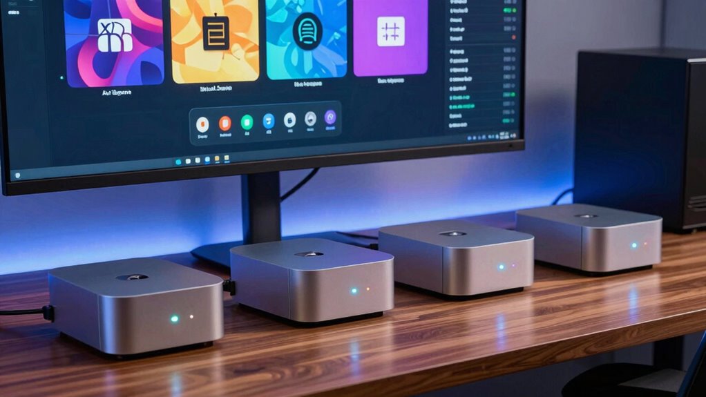 Ecosystem integration is a crucial factor to consider because it guarantees that your Mac Mini works seamlessly with other Apple devices, making media sharing and control effortless. With features like AirPlay, you can wirelessly stream music, videos, and photos from your iPhone or iPad directly to your Mac Mini, transforming it into a powerful media hub. Continuity features such as Handoff and Message Sharing enable smooth workflows and easy communication across devices, saving time and effort. Additionally, compatibility with iCloud ensures your media libraries are synchronized and backed up across all your Apple products. Deep integration with services like Apple Music, Apple TV, and HomeKit further enhances your media management and automation capabilities, creating a cohesive ecosystem that simplifies entertainment and device control.