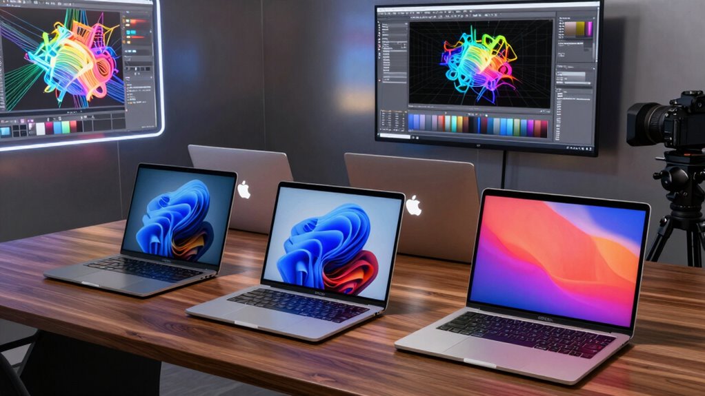 When working on detailed 3D models and complex VFX projects, display quality becomes a top priority. A high-quality display with a peak brightness of at least 1600 nits guarantees vibrant visuals and accurate color representation, which are crucial for precise editing. An expansive contrast ratio of 1,000,000:1 provides deep blacks and bright highlights, adding depth and realism to your work. Technologies like Liquid Retina XDR offer professional-grade color accuracy and wide color gamuts, necessary for consistent results. A large, high-resolution screen (14.2 inches or bigger) enhances workflow by allowing detailed views of models and effects without constant zooming. Consistent brightness levels and strong HDR support are essential for previewing how visual effects will appear under various lighting conditions, ensuring your work looks perfect everywhere.