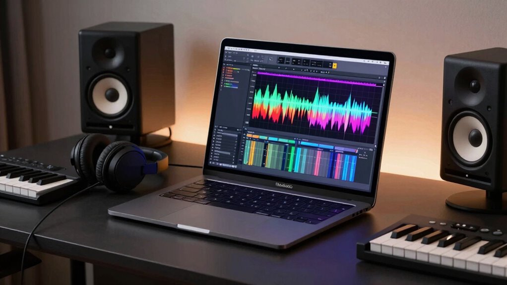 Choosing a MacBook Pro with enough processing power is vital for smooth and efficient music production. High-core count processors, like a 10-core CPU, are essential for handling real-time audio processing, mixing, and large sample libraries without lag. They also support complex virtual instruments, guaranteeing seamless playback. Modern processors with Neural Accelerators speed up AI-driven features such as smart comping and audio analysis, saving time. Multithreaded tasks, including plugin processing and mixing multiple tracks, demand robust multi-core performance to prevent latency issues. Faster processors also considerably cut down rendering times, enabling quicker project exports and a more efficient workflow. Investing in a powerful CPU ensures your setup remains capable of meeting the demanding needs of professional music production in 2026.