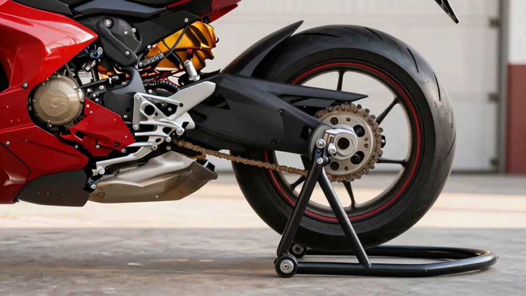 Did you know that around 65% of sportbike owners use rear paddock stands regularly? Yes, you can definitely use a rear paddock stand on a sportbike with a swingarm. Just make sure the stand is compatible with your bike’s swingarm type—whether it’s a single or dual-sided setup. I always double-check the stand’s specifications before use to guarantee a safe, secure lift for maintenance or storage.