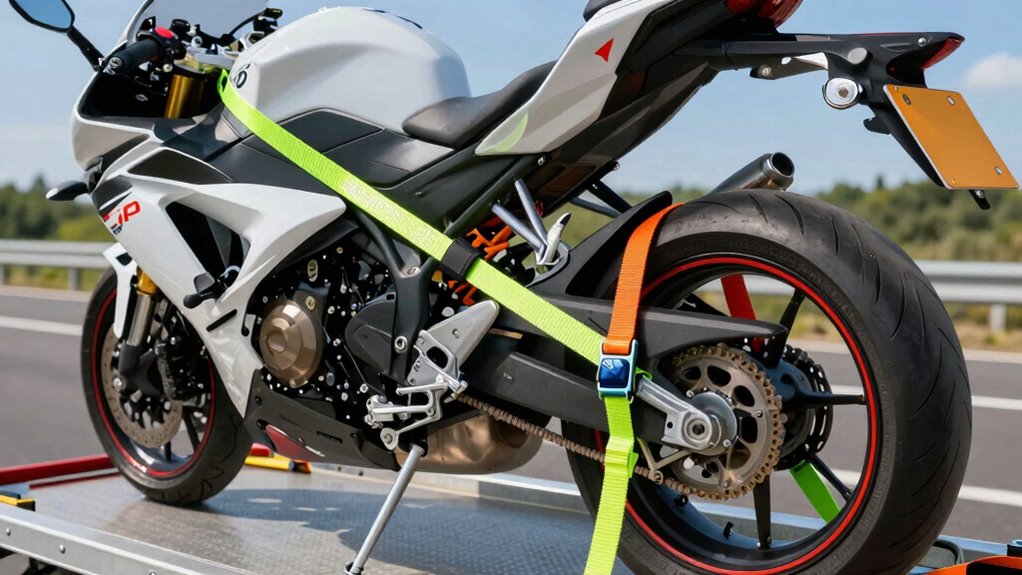 Think of securing your motorcycle like guarding the Crown Jewels—you want it tight but not crushed. I always check that straps are in good condition and securely attached to sturdy anchor points. I avoid over-tightening to prevent damage, and I double-check everything before hitting the road. Wearing gloves helps me get a firm grip, and I make certain the motorcycle is stable, so I avoid surprises during transit. Safety first!